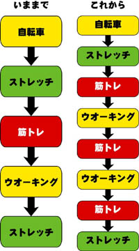 | 第14回 週二回運動すること、 新たな目標のことなど。 ふうふう、ぜいぜい。シェフです。 前回の更新から一ヶ月。ですが、 さぼっていたわけではありません。 地味に、地道に、トレーニングをしていました。 (ほんとよ) この一ヶ月のことを、ご報告いたしましょう。 ■■■■■■■■■ 「26〜27%」のまま留まる僕の体脂肪。 粘る粘る。「減らない貯金」なら嬉しいのに。 週一回、きちんとカラダを動かして、 食事にも気をつけているというのに、 何で停滞しているんだろう。 一気に体重も体脂肪も目標値に近づいた アッキィさんと何が違うんだろう??? ◆運動の質を高める 「タケイさん、それは運動の“質”ですよ」 え、野上トレーナー、何ですって? 前に、「主観的運動強度」(RPE)のことを 教わったけど、それを高めるってこと? 「それももちろんありますけど、 もうひとつ、あるんです。 僕らも、アッキィさんチームのように もうひとがんばり、しましょうよ」 うえ? アッキィさんたちは それをやってるの? けっこう、同じようなメニューで トレーニングしてきたと思っていたんですけれど。 「それが、じつは、ここ何回か、 アッキィさんのトレーニング方法は、 変化していたんですよ」 どどどーいうことですか!? 僕にナイショで!? けしからん、プンプン。 でも、思い返してみると、たしかに、 アッキィさん&斎藤トレーナーのチームは、 ちょっと違った動きをしていました。 「早い」んです。行動が。つまり、 ●インターバル(休憩)がほとんど、ない。 ●筋トレの間に、短いウオーキングが入る。 ということなんです。 「筋トレの間のウオーキングは、 “歩きながら休む”ってことですね」 ……それって、休むって言わないと思う。 でも、強い負荷がかかった筋肉のクールダウンは べつに「なにもしない」状態でなくても、 歩きながらだって、いいわけです。 そりゃそうだ。 「やってるときはきついかもしれないですけど、 いままで最後に行っていたウオーキングを 途中に分断して挟み込んでいるだけですよ」 それもそうだ。 「そういうふうにして“運動の質を高め”ているんです」 うん、わかりました。 ぜひ、僕らもその方法、取り入れましょう。 ◆運動の量をふやす 「でも……タケイさんの場合、 それだけじゃ、まだ、足りないかもしれないですね。 ほら、摂生してるったって、よく食べるし…… ほんとうは、週1のトレーニングを せめて2回にできると、もっといいんですけど」 ひーん。週2回!? 週1回がやっとですよお。 「でも、たとえば土日のどちらかに2時間だけとかでも ムリですか? ずっと、とは言いませんが、 1ヶ月だけ限定で、やってみてはどうでしょう? 僕(野上)が時間が空いているときは トレーニングにつきあいますよ」 そ、そ、そこまで。じーん。ありがとう野上さん。 ならば、1ヶ月だけ、週2回のトレーニングを やってみようではないですか! ……そして、一ヶ月。自分でも驚くほど真面目に トレーニングをしてみました。 すると、こうです。