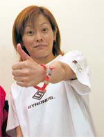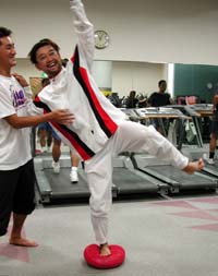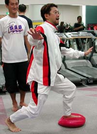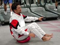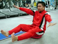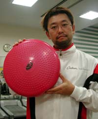 | 第16回 先生が変わりました。 ほぼにちは、シェフです。おひさしぶりです。うっす。 前回の更新から、ン十日、ではないですか! いかん。 なぜ更新がとどこおっていたのかといいますと、 それは、ひとえに、「痩せてない」から……。 あまりの情けなさに、といいますか、 ほら、なんというか、恥ずかしくって。くねくね。 「……いや、ほら、シェフさー、 痩せなくて恥ずかしいっ、なんてさ、 太ってるのにくねくねしながら言ってないで、 “痩せないこと”の報告を書けばいいんじゃないの?」 はっ、darling。そうでした。 あたいは、デート前日に体重計に乗ってる女子中学生じゃないわっ! というわけで、報告いたします。 体重、体脂肪、ほとんど、変わっていません。 まじめなはなし、なぜなんだろう。 トレーニングは週一回、 きちんとしています。 週一回どころか、じつは、日曜に水泳もしてる。 この夏は陽にも焼いたりして、痩せて見えるくらいです! ばりばりですぜ。ばっちりです。文句つけようがない。 (……ちょっと嘘です。) 変わらないんだなあ。 やっぱり、問題は「食べる量とバランス」でしょうか。 うじうじ。 そんな湿ったわたくしに、秘密兵器が投入されました。 それは、この人物です!!! ![]() 池田佐和子先生といいます。 ストロングス所属の、 フィットネス・チーフインストラクター! チーフですよ、チーフ。 健康・スポーツ雑誌のモデルとしても活躍してるんだって! キビシく、かつ、親身な指導で生徒に人気のある、 スバラシイ先生なのです。それが、かわいそうに、 「痩せないあのデブをなんとか引き締めろ!」 とトップからの命を受け、 オアシス青山に、毎週、通うことになりました。 ←あのデブ。僕は、前任の野上コーチが修業の旅に出るため退任したあと、 ちょっと、ダレていたのかもしれません……。 (ふつうに、食べてたもんなあ。 その“ふつう”が、ふつうじゃないし……) 後任が女性トレーナー、と聞いたわたくし、 正直、最初は、たかをくくっておりました。 ラクができるんじゃないか、と。 しかし、それは甘かった。 池田先生、ほんとに厳しいんです。 野上さんが「はい、これで終了っす〜!」というところを、 「シェフさん、ほんとはもっとできますね? あと2回だけ、がんばりましょう。 わあ、できましたね! じゃあ、もう1セット!」 と、とってもつらく当たる……んではなく、 親切に指導してくださるのです。 「い、いけだせんせい、 僕はこのレッグカールっちゅうのが、 とても苦手なのです……」 「あら! そうですか。 私は、大好きです。だから2セット、 いつもよりちょっと重くして、レディ・ゴー!」 「ひーん。もう、だめです〜」 「なーにをふざけてるんですか! あはは。 泣きまねですか! シェフさん面白いですねー。 ……さあ次! ワン・トゥー!」 先生は笑いながら、僕は泣きながら、 こうして厳しくされる日々が、 始まってしまったのです……。 「私の今の人生の目標は、 シェフさんの体脂肪率を下げることです!」 そうおっしゃってくださる池田先生のためにも、 わたくし、がんばります! (ちなみに、アッキィ=斎藤トレーナーのコンビは、 変わらず、続いていますよ〜) さて、池田先生に変わってから、 トレーニングの内容も、ちょこっと変化しました。 少し重くなったり、回数が増えたりといった マイナーチェンジのほかに、新種目もあります。 たとえばこの「アジリティディスク」。 一般的には“バランスボード”と呼ばれています。 直径34センチで、高さは6.5センチ(平べったい)。 ゴムボールをぺちゃんこにしたような感じです。 イボイボがついてて、すべらないようになってます。 これ、どうやって使うかというと、 ただ、乗るんです。 アッキィは、ふざけているわけではありません。 体重をかけると、グラっとするんです。 そこをがんばって、ふんばるわけです。 それが、身体の各所の筋肉を使わないとできない。 これも、ふざけているわけではありません。 ちょっと怖いくらい、揺れます。 片足立ちは、そうとう難しい。 座るだけ、なのに、たいへん。 腹筋なんか、プルプル言っちゃいます。 手足をジタバタさせてバランスをとるんですが、 これを「15秒以上、静止」させるのがまずは目標でした。 (ちなみに、できませんでした) さ、今日(水曜)もトレーニングです。 がんばりまっす。