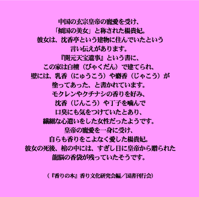 ![]() いにしえの時代から、「香り」は 人の心を惹きつけて離さない力を持つものとして 捉えられていたのですね。 美女だったと伝えられている歴史上の人物には クレオパトラをはじめ、 「香り」のエピソードがつきもののようです。 |