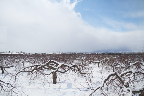 ▲そとは豪雪。見渡す大地に根ざす樹木たちは林檎です。