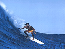 | ■Vol.4 “Eddie Would Go” Part1 初めてハワイのhe'e nalu (ヘエ ナル=サーフィン)が外国に 紹介されたのは1779年のこと。 キャプテン・クックとともにハワイを訪れた キャプテン・キングという人が書いた 記録に残されています。 彼は、優雅でリズミカルな ハワイアン・サーファーたちの姿を まるで波の上でダンスしているようだと 書き記しています。 西洋人にとって、大きな波は自然の驚異でしかなく、 それをポリネシア人が楽しみとして 乗りこなしているのは、まさに驚きだったようです。 残念ながら、サーフィンの起こりが 一体いつ頃だったのか、知る方法はありません。 二つの船体を横につなげたポリネシアの伝統的なカヌーや アウトリガーと呼ばれる転倒防止用の 細長い材を備えたカヌーに乗った漁師たちが 最初にサーフィンを始めたのだろうというのが 定説になっています。 漁師たちは小さなカヌーを漕いで海に出て、 戻る際には上手に波に乗って 浜にカヌーを乗り上げていました。 サーフィンがスポーツになったのは 波に乗ることだけを目的にして、 小さなカヌーをもっと小さな板に 変えたことが始まりです。 ハワイに古くから伝わるmele(メレ=歌)や mo'olelo(モオレロ=物語)には サーフィンの様子が描かれています。 太平洋岸の国々では、生活の知恵としての 波に乗る技術が伝えられていたりしますが スポーツとしてのサーフィンの発祥の地は ハワイなのです。 1820年代に伝道師がハワイにやって来るまで、 ハワイ人は何百年もの間サーフィンを楽しんできました。 ところが文明国から来た人々は、 サーフィンやhula(フラ=ハワイの伝統的な舞踊)を 野蛮で意味のないもの、時間の無駄だと決めつけたのです。 そうして1890年頃には、サーフィンはほとんど ハワイから消えてしまいました。 ほんのいくつかの秘密の浜で こっそり練習する人がいるのみとなりました。 しかし、19世紀の終わり頃 King Kalakaua(カラカウア王)が 権力を握ったのをきっかけに ハワイのスポーツ、ダンス、音楽が 息を吹き返し始めました。 そしてサーフィンもまた、それらの文化と同じく ハワイに戻ってきたのです。 現代になって、ハワイが サーフィンの中心地であることを 世界に知らしめる役割を果たしたのが Eddie Aikau(エディ・アイカウ)です。 彼が波に乗る姿は、優雅で まったく波を恐れることなく、 かつてキャプテン・キングがため息を漏らした ハワイ人ならではのサーフィンを彷彿とさせました。 まるで、彼の魂が波と一体になっていると 思わせるほどの、類い稀な才能を持っていました。 1967年、彼が21歳の頃のことです。 Waimea Bay(ワイメア・ベイ)で、彼はなんと 40フィート(約12メートル)の巨大な波に挑みました。 そのとき、何人かの 世界的に有名なサーファーもその場にいましたが、 40フィートもの高波はあまりに危険なため、 常識として挑戦する者などいなかったそうです。 ところがそこへ現れた現地の若者が その波に乗り始めたのです。 しかも、落ちたら間違いなく命を失う高波の上で 彼は恐れる様子もなく 踊るように波乗りを楽しんでいる……。 その頃、誰一人として 彼の名前を知る者はいませんでした。 しかし、彼の姿はその場にいたすべての者の目に しっかりと焼き付けられました。 photographed by Dan Merkel アンクル・エディ(私は彼のことをそう呼んでいます)は、 私の父と同じように ハワイ人であることに誇りを持つようにと 教育され大人になりました。 彼は6人兄弟の3番目で、兄弟はみな 海をとても愛していました。 アンクル・エディのお父さん、アンクル・ジュニアは 休みになると必ず子供たちを海に連れていき 一緒にサーフィンを楽しみました。 そんな環境で育ったアンクル・エディと 弟のアンクル・クライドは、 やがてサーフィンの才能を開花させます。 アンクル・クライドもまた、兄と同じく ビッグ・ウェーブ・ライダーの 第一人者として知られています。 アンクル・エディのずば抜けた サーフィンと水泳の技術は広く知られるところとなり、 彼は、波が高く危険なワイメア・ベイの 初めての救命員に指名されます。 ワイメア・ベイは、彼が40フィートの波に 果敢に挑んだことで彼を有名にした場所であり、 そして、かつては彼の先祖のヘヴァヘヴァが ずっと所有していた土地でもありました。 ワイメアを我が家のように 愛していたアンクル・エディは、 そこで若いハワイ人のサーファーたちに ビッグ・ウェーブの乗り方を教えたりもしていました。 彼の教え方というのは、 まず、若者に海の恐ろしさを説き、 そして、それに打ち勝てるだけの 知識と技術を教えるというものだったそうです。 ハワイで人気のハンバーガーショップ “クア・アイナ”の青山店。 店内の壁には有名なサーファーの写真が ずらりと飾られている。 その中にはエディ・アイカウの雄姿も (右の壁中央の列下の写真)。 ハンバーガーはちょっと高いけどすんごくうまい。 クア・アイナ青山店 港区南青