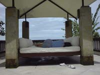 ベランダ。四阿のようなベッドがでーんと据えられている。