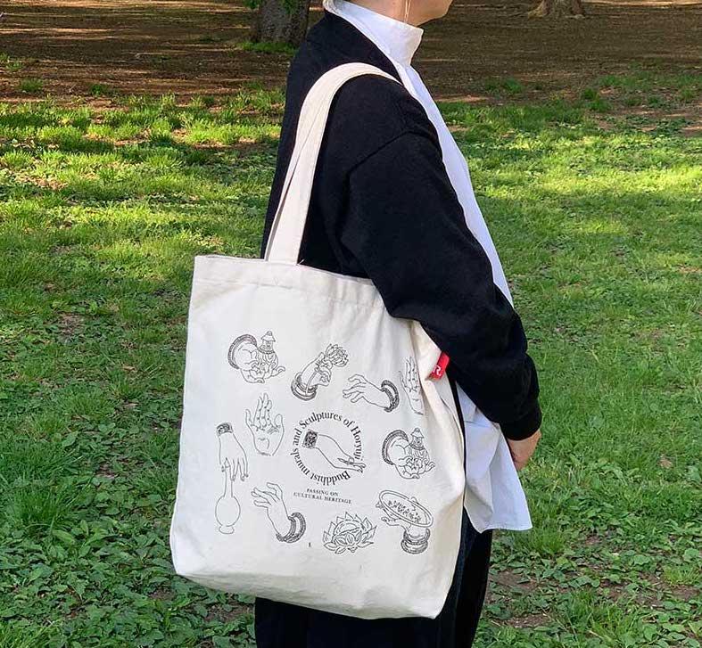 百済観音の手を描き起こしたデザインのトートバッグ。