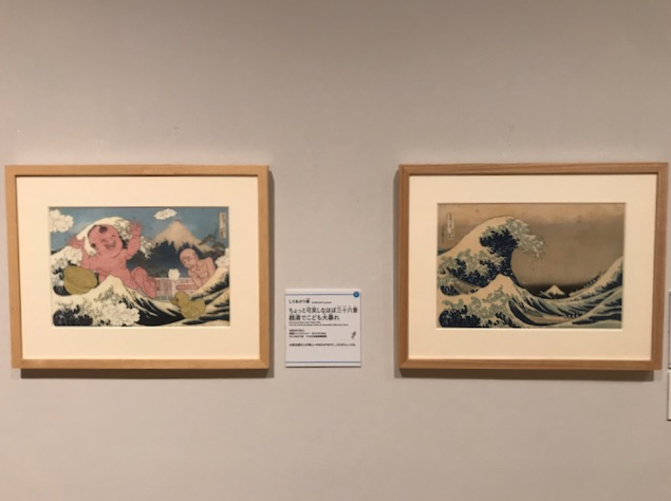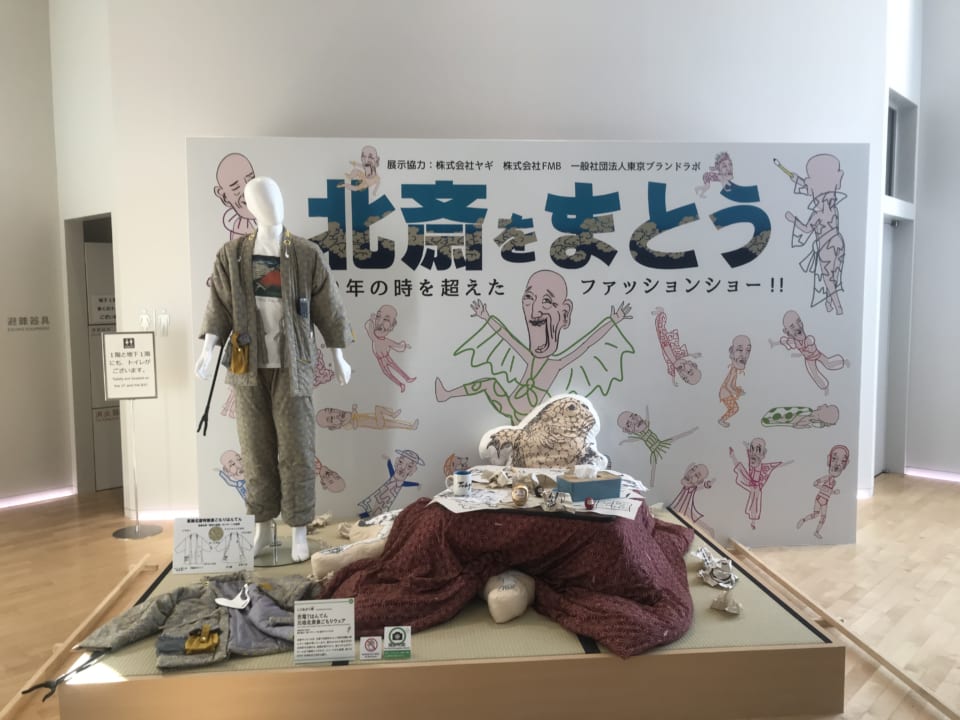 〈手前〉しりあがり寿「瀧廻りポンチョ」展示協力:株式会社ヤギ、©しりあがり寿 すみだ北斎美術館蔵(通期)