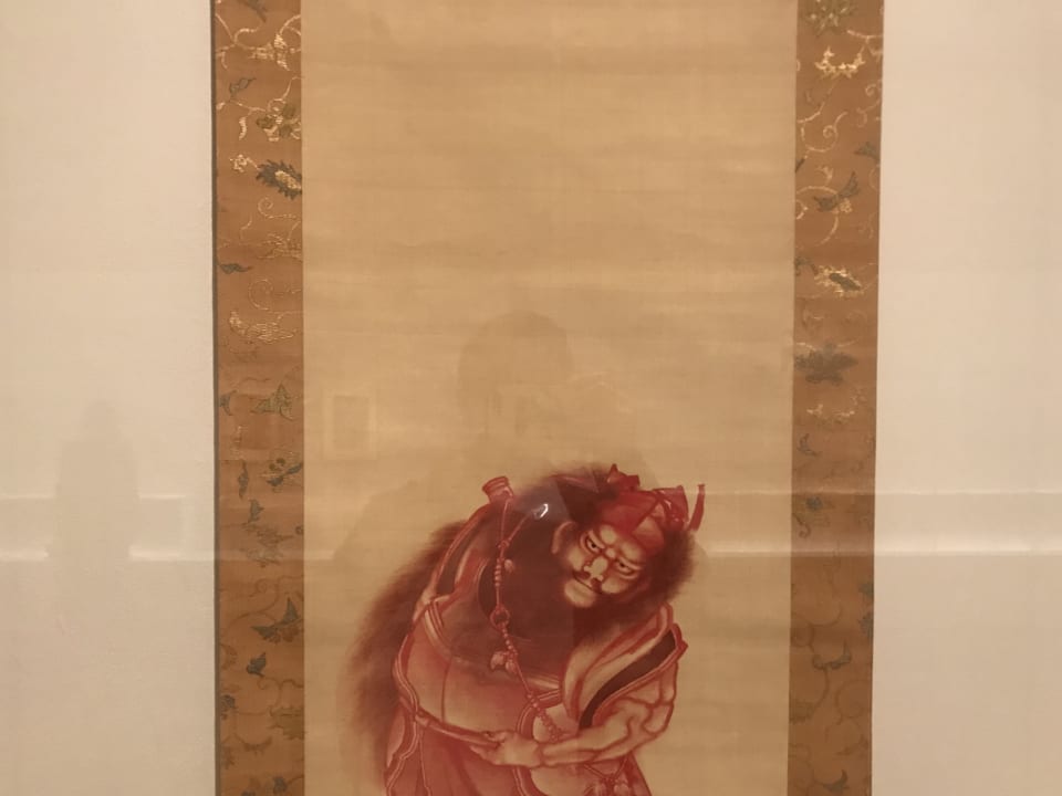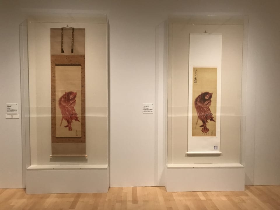 左:葛飾北斎「朱描鐘馗図」すみだ北斎美術館(前期) 右:しりあがり寿「コロナ退散 2021」©しりあがり寿 すみだ北斎美術館蔵(通期)
