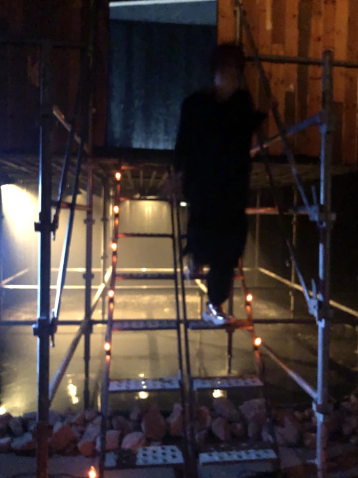 ひとつめの部屋を見終え、 踏み外さないようゆっくりと 階段を降りてくるマイコさん。 ドキドキ… (スタッフの方が足元を 照らしてくださってます。ご安心を)