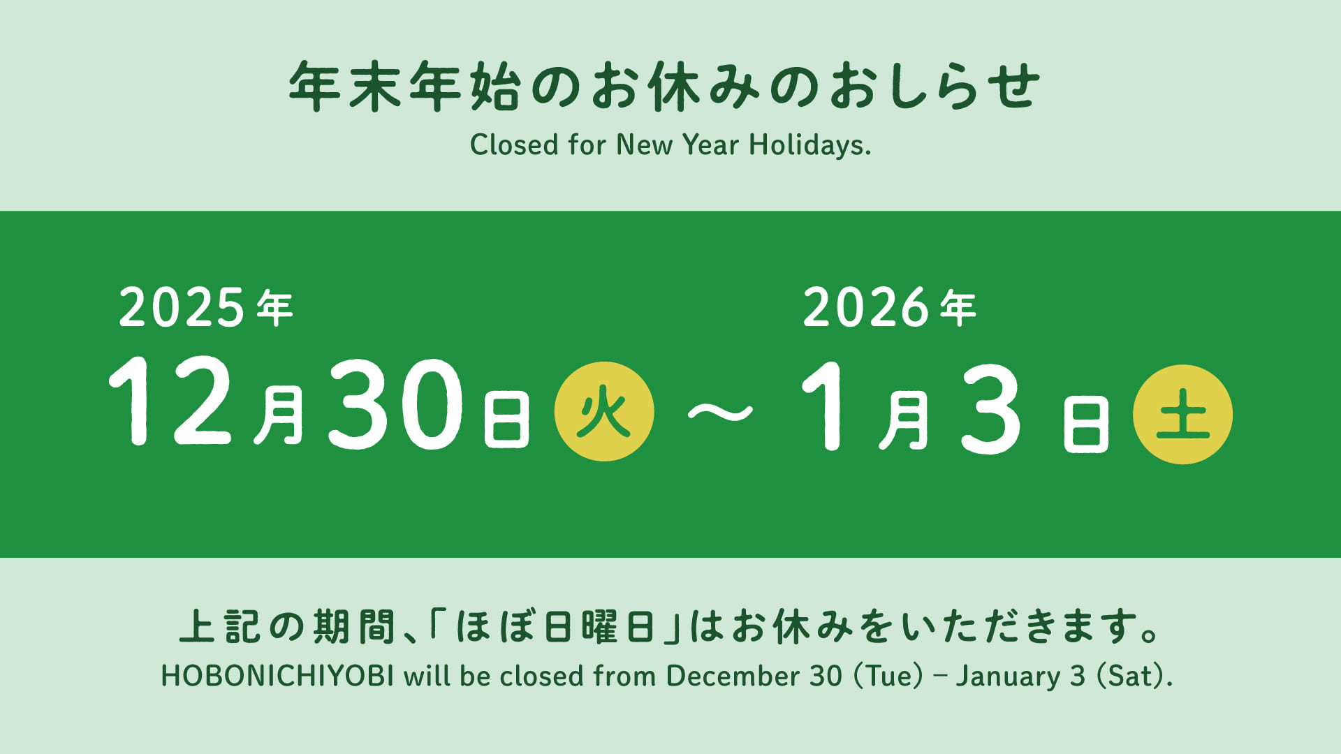 “Hobo Nichiyobi” will be closed for the New Year holidays