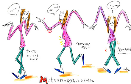 わたしのイニシャルは「F」! 本名は「Y.O」。 でも「M」をほめます!! 女性のみなさん、ほぼにちわ! あなたは今、おいくつですか? わたしの年齢は今、ほぼ人生の折り返し地点です。 折り返しということは二つに折るってことで その頂点こそが、「折り返し地点」ってことでしょ? それって「とんがってる」から わたしたちの世代は「とんがった」世代なのです。 これは昔「バービーボーイズ」のコンタさんが 広島のコンサートで 「イエ〜イ!今日はコンサートの折り返し地点だぜ! ってことは、広島が1番とんがってんだぜ!!」 と、おっしゃっていたので、パクリました。 今日はちょっとまじめですよ! 「女の一生」についてお話しします。っていっても 「杉村春子先生」の「女の一生」じゃないですよ! 「女の一生」とは「M型」だそうです。 っていっても生命保険の商品名じゃ、ありませんよ! アルファベットの「M」のように 女の人生は生れてから徐々に右肩上がりのライン。 美しさ、知識、行動力などが増していきます! そして、一端、ピークに達します。 これが大体20歳〜25歳。 OLなんかしてお金もある時期。 その後、結婚、出産、育児などに追われ 自分に構わなくなる時代が来ます。 ラインは下がりはじめます その1番どん底のころが30歳〜35歳。 子供の教育費、医療費、食費なども増え お金がどんどん出て行き始めます。 そのまま、なんとなく、時が過ぎてしまい 横ばいの人も中にはいらっしゃいますが 子育てが楽になり始め、だんだんおしゃれや知的好奇心が 戻ってきてまた、少しずつ上がっていくの。 お金も夫の出世などで余裕が出てくるはずなんだけど これは今の時代ちょっと、当てはまらないかもね。 でも、子どもが大きくなったんだから 自分だって働けるでしょ? で、後は努力次第だけど 「老い」という形で、徐々に下降線をたどるわけです。 このラインがアルファベットの「M」に似ているから 「M型」といいます。 そう、「M」って「女の一生」を一文字で表現してるの! すごいでしょ!? その上、事実「女の一生」の節目節目に「M」あり! その1 思春期に始まる「MONTH」の「M」 日本語で「メンス」 その2 好きな人が出来て「MARRIAGE」の「M」 その3 子どもが生まれて「MOTHER」の「M」 その4 「MONTH」があがってしまって「M」 ね! でしょ? そんな「M」に魅せられたわたしは、 さらなる「M」のパワーを知ってしまったのです。 それは「森光子」さん。 イニシャルは「M.M」 「森光子」さんと言えば以前、ここでもほめた 「東山紀之」さんとのロマンスが有名ですが ご存知ですか? 彼女が彼に出会ったのは 彼女がなんと、63歳の時なんですよ! もう、20年ものお付き合いだそうですが 20年もお付き合いが続く男性との出会いが 63歳だったなんて なんだか、これって、いいような悪いような‥‥。 いや、いいです! しかも、年の差なんと40歳以上!! いや〜、やるね〜、「光子」!! かっこいいでしょ!! 東山さん曰くおふたりのご関係は 「恋人以上、結婚未満」だそうです!! きゃ〜〜、何? それ!! 何だかわかんないけど なんか、よさそう!! で、わたくし、この事実からあることに気付いたの! そして「Mの法則」というものを発表しました。 自分の家で。 その内容はこうです。 「目的さえ持って、歩きつづければ必ず目的地に着く」! おお〜、あたりまえじゃん! あたりまえなんだけど、これってすごい発見なのよ! たとえ、逆回りでも、遠回りでも、獣道でも 歩きつづけさえすれば、絶対に目的地に着く。 着かないとしたら、それは歩くのをやめたときか 目的を見失った時なのです!! どう? 心の底から「わかってた」と言えますか!? 目的達成のコツはこれでした。 目的というと、「ビジネス」っぽいけど わたしが言ってるのはどっちかというと 「憧れの人」のほうです! 「憧れの人」に向って、日々小さな歩みをするのです! 「どうせ、住む世界が違うんだから」なんて言って 歩かないと、絶対に到着しませんよ! だって、松田聖子さんだってそうやって郷ひろみさんと 出会えたんですから!! ここで、注目! 松田聖子さんのイニシャルは「M」 そう考えてみるとスーパースターの イニシャルって意外に「M」が多いんですよ! マイケル・ジャクソンさん マリリン・モンローさん マドンナさん マレーネデードリッヒさん マリーアントワネットさん ミッキーマウスさん 松任谷由実さん 松田優作さん 美空ひばりさん 森昌子さん 森進一さん モーニング娘。さん などなど。 ね。 きっとこの人たちの共通点は 「Mの法則」でしょう! 目標に向って歩きつづけたのです! しつこいようですが、「M」は 「森光子」さんからいただきました。 あと「M」は少しだけ 男性の「ヘアースタイル」にも関係あります。 鶴瓶さんとか、所さんとか・・・。ね! ちょっぴり髪の毛が寂しくなった男性の その「はげ方」にも色々ありますが わたしは断然「M」派!! だって、かっこいいでしょ? なにか頭に「マーク」が入ってるみたいで! でね、余談です