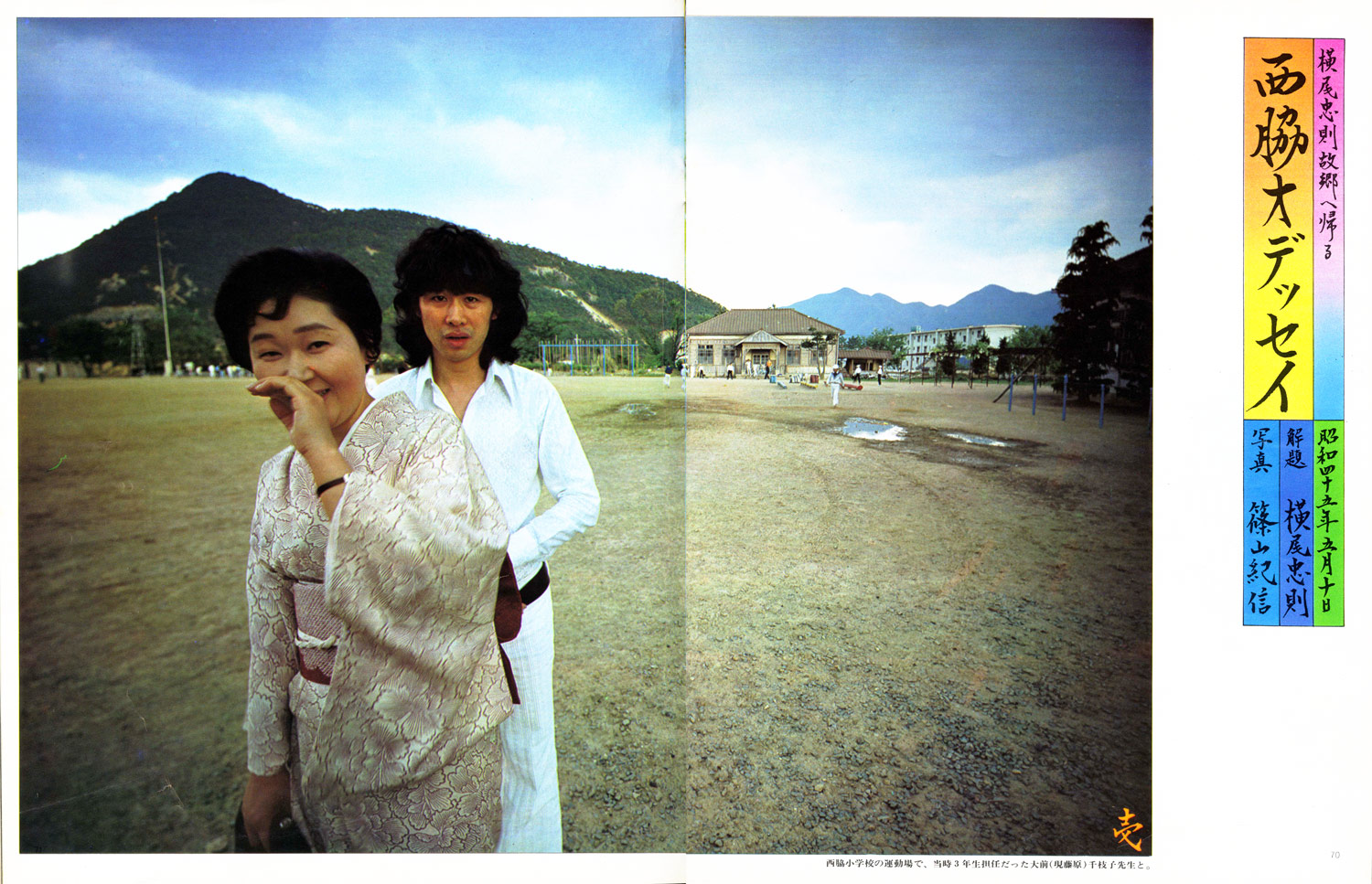 ▲創刊7号。横尾さんの出身小学校を訪ねて当時の担任の先生と撮影。デザインの遊びもたっぷりで、