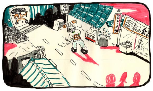 左側を歩いて坂を下っていくと、向こうから数人の女性達。