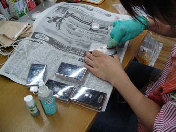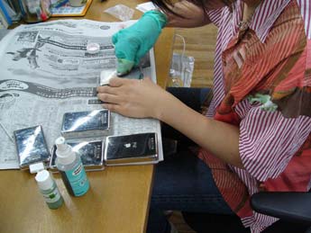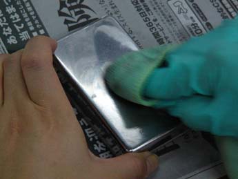まず、スプレー式のOAクリーナー。 モニターやキーボードの汚れが 一拭きできれいになるので、 長年愛用しています。 実はこれに一番期待をかけてました。 が、使ってみると、iPodの鏡面はまったく変わらず。 ステンレスには通用しないみたい。 気を取り直して、ジュエリークリーナーをお試し。 金や銀製品を磨く特殊な薬品がしみこませてあって、 ピアスとかすぐにピカピカになるのです。 ところが、使ってみると、 曇りが消えてピカピカになったのですが、 傷が消えずに残ってます。 きれいになった分、ほんの小さな傷も 目立つようになってしまいました。 貴金属用のクリーナーもいまいちってことですね。 では、iPod専用クリーナーはどうなのか?! 袋の中には手袋と布、そして、軽度の汚れ落とし液、 深い傷&ガンコな汚れ落としクリームが入ってます。 今回は、深い傷&ガンコな汚れ落としを使うことに。 説明書には、 「皮膚に有害な物質を含んでいるため、 手に付属のゴム手袋をはめてから 作業をはじめてください」 とありました。ひええっ強烈! ちょっとおっかなびっくりで準備を始めました。 なにせ、5,229円のクリーナーです。 きっとびっくりするほどマジックな効果が出るに違いない! ワクワクドキドキしながら、磨き始めました。 磨く手順はとてもシンプル。 (1)iPod の鏡面にクリームを塗る。 (2)優しく小さな円を描くように磨く。 (3)クリームがかたくなって表面が黒くなったら 別のタオルで黒くなった表面を拭く。 傷がなくなるまで、(1)〜(3)を 何度も繰り返せばOK。 さっそくスタートしました。 ![]() ▲磨き始めた頃。気分もルンルン。 軽やかな手つきでクリームをぬりぬり。 白っぽかったクリームが、だんだんどす黒くなり、 アンモニアと金属が入り交じったニオイが充満してきます。 クリームは次第に水気がなくなり、 摩擦が増してきて、 乾きかけのボンドを練っているような感触。 タオルがiPodにぺっとりくっついて、 指を動かすのが大変。 こうなったら、気合いです! 気合い! ![]() ▲20分経過。 「傷が落ちない場合は、何度も繰り返す」と、 説明書あったので、クリームをつけて磨く作業、 3回目に突入。 ![]() ▲かれこれ30分を経過。姿勢も次第に前のめりに。 通りがかったシェフさんに 「女工哀史みたい。がんばって」と励まされる。 磨き始めて40分を超えました。 腹筋と指先に力を入れて気合いで磨いていたため、 額から汗がだらだら。 早く終わらせたくて、 スピードを上げて、がしがし磨きました。 ![]() ▲さすがに40分以上磨いていると指が痛いっ。 「小さな円を描いて優しく」なんてムリ! 次第に上下の動きに。しかも猛スピード。 ![]() ▲手袋が1枚しかついてないので、 iPodを押さえる左手に有害な物質がつくのでは?! と、びびりましたが、 ついてもなんともなかったです。 50分を超えようとするところで、 ようやく小さな傷は見えなくなり、 大きな傷も目立たなくなりました。 タオルは真っ黒になりました。 ![]() やった! やっと終わった! 気力を使い果たして、脱力〜。 というわけで、結果発表です! ☆ピカピカ度結果発表☆ ●OAクリーナー