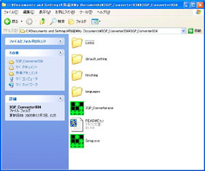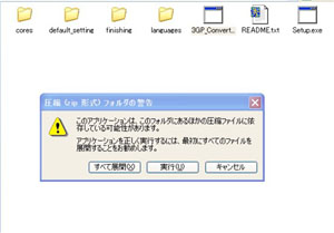 サイトにある「ダウンロード」ボタンをクリックして、 ダウンロードします。 ファイルができますので、 この中にある「3GP_Converter.exe」を ダブルクリックします。 ![]() すると「圧縮(zip形式)フォルダの警告」の画面がでます。 ここでは「すべて展開」をクリックします。 次に、「圧縮フォルダの展開ウィザード」の画面が 出てくるので、「次へ」ボタンをクリックします。 ![]() さきほどダウンロードをしたのと同じところに、 フォルダができています。 (解凍前のフォルダと同じフォルダ名ですので、 ご注意ください。) そのフォルダの、さらに中にあるフォルダの中身を見ると、 7つのフォルダとファイルが入っています。 「README.txt」には困ったときの 対処法などが書かれています。 「.exe」とある2つのファイルを使用します。 他のファイルはそのままにしておいて大丈夫です。 ![]()