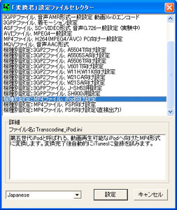 変換の形式を設定します。 「Setup.exe」をクリックすると 『「変換君」設定ファイルセレクター』 の画面が出てきます。ここで 「機種別設定:MP4ファイル,iPod向け設定」 を選択して、 次に右下の「設定」をクリックします。 これで設定完了! いよいよ動画の変換です! ![]()