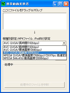 「3GP_Converter.exe」というのが、 「携帯動画変換君」の本体です。 (ショートカットアイコンを デスクトップに作っておくのもおすすめです。 ) これをクリックすると、 「携帯動画変換君」が出てきます。 まず、真ん中にある 「機種別設定:MP4ファイル,iPod向け設定」 と書かれた下のところで、 「AVC QVGA/長時間(192kbps)」 「AVC QVGA/標準画質(384kbps)」 「AVC QVGA/高画質(600kbps)」 「MPEG4 QVGA/高画質(768kbps)」 「MPEG4 544×416/最高画質(2000kbps)」 ‥‥など、画質を選べるようになっています。 「長時間」とは画質の良さよりも データを小さくすることを重視している形式で、 標準画質、高画質、最高画質とデータ量が 多くなるにつれ画質がよくなり、同時に、 ファイルの重さも重たくなります。 (iPodにはたくさん入らなくなります。) また、AVCとMPEG4は動画圧縮の方法です。 AVCはH.264のことで、 「H.264」「AVC/H.264」「H.264/AVC」 とも呼ばれます。 AVC/H.264のデータ圧縮率は、 MPEG2の2倍以上、MPEG4の1.5倍以上です。 つまり、「AVC」の方が、「MPEG4」よりも ファイルのサイズが小さくなります。 いろいろ試して、お好みの画質を選んでください。 ![]() 次に「出力先ディレクトリ」の「選択」ボタンを押して、 iPod用に変換した動画を保存するフォルダを選びます。 「選択」ボタンを押さなかった場合、 iPod用に変換されたファイルは、 デスクトップ上に保存されます。 こちらでも後で曲やビデオが入っている iTunesのフォルダに 自分で移動させればいいだけなので、 まったく問題ありません。 最後に「ここにファイルをドラッグ&ドロップ」に iPod用に変換したい動画のファイルを ドラッグ&ドロップします。 すると、あっという間に iPod用の動画ができてしまいました! あまりにもあっけないほど簡単で、 先週「自分で挑戦します!」と 息巻いたのが恥ずかしくなったくらいでした。 さて、以上でWindows用の動画変換ソフト 「携帯動画変換君」のご紹介は終了です。 また、別の機会にMac用の動画変換ソフトにも トライいたしますね! そのMac用の「Mac用の動画変換ソフト」ですが、 読者の方から新たなご紹介をいただきました!
