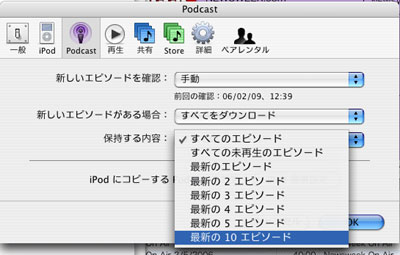 最新番組のダウンロードのしかたや、 パソコンに保存しておく番組数については、 iTunesで設定することができます。 WindowsとMacでは iTunesのメニューが若干異なるのですが、 Windowsの場合、iTunesのメニューを 「編集」→「設定」→「podcast」と進んでください。 Macの場合は 「環境設定」→「podcast」と進んでください。 ![]() Macでの設定画面です。 ダウンロードする番組は「エピソードがある場合」 という項目で設定します。 登録されている番組をすべてダウンロードするなら 「すべてをダウンロード」を選び、 一番最近の1番組だけをダウンロードするなら、 「最新のものをダウンロード」を選んでください。 また、iTunesに保存する番組は 「保持する内容」という項目で設定します。 全部を保存するなら「すべてのエピソード」を、 最新の1番組だけ保存するなら 「最新のエピソード」を選びます。 たぶん、ゆききさんのiTunesは、 「最新のものをダウンロード」して、 「最新のエピソード」だけ保持する設定に なっていたのだと思います。 「すべてをダウンロード」して 「すべてのエピソード」を保持する設定にすると、 番組がどんどんパソコンに保存されていきますから、 気がついたらパソコンの容量がいっぱいだった ということにもなりかねません。 設定はパソコンの容量と相談してくださいませー。 さて、引き続き、ポッドキャストや ビデオポッドキャストの情報をお待ちしております。 その他、iPodにまつわるエピソードや質問を 募集中です。よろしくお願いします! こんな投稿、 がんがん募集いたします!