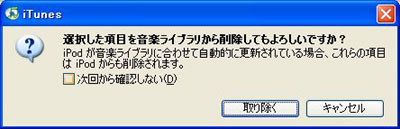 ■iTunes内で重複している曲を整理しよう! iTunesのライブラリの曲がたくさんになっていくと、 曲が重複していることがあります。 例えば、私の例で言えば、 ビートルズの「Let It Be」は 「The Beatles」「Beatles」の 2つのアーティスト名で、 ベスト盤と「Let It Be」のアルバムから 取り込んでいて、全部で4曲入っています。 マスタリングが違う、 というようなことであれば別ですし、 アルバム単位で聴きたい方は 重複していてもいいのですが、 パソコンやiPodの容量が足りないときは、 1曲にした方がよかったりします。 重複している曲を確認して、 いらない曲を削除して、 iPodの空き容量をふやしましょう! ![]() ▲重複した曲を確認するときは、 iTunesのメニューの「編集」<「重複する曲を表示」を選びます。 ![]() ▲重複した曲が表示されます。 重複した曲が表示されたら、念のため、 曲の時間の長さなどを確認してください。 アーティスト名と曲名が同じだと、 iTunesでは“同じ曲”と見なします。 しかし、バージョンやアレンジの違う曲と いうこともありますよね。 iPodに入れなくていい曲や iTunesから消したい曲が決まったら、 さっそく消しましょう! 曲を消す方法には、 iTunesのライブラリに残す方法と、 iTunesのライブラリからも消してしまう方法の 大きく2つの方法があります。 ★曲をiPodに転送しないように設定し、 iTunesのライブラリには残す方法 iPodの環境設定で、 「チェックマークのある曲だけ アップデートする」を選び、 iTunesの「曲名」の左端にある チェックボックスのチェックマークをはずします。 チェックのない曲はiPodに転送されなくなります。 くわしくは ■アップルオンラインチュートリアル Vol.11 iTunes、iPodで音楽を楽しむ ■#0046 初心者向けiPodの困った! 解決 をご参照ください。 ★曲をiPodからも、 iTunesのライブラリからも消す方法 iTunesのライブラリから曲を消すには、 2つの方法があります。 ひとつは、ファイルをパソコンに残しておいて、 iTunesのライブラリでは表示させない方法、 もうひとつはパソコンから ファイルそのものを消してしまう方法です。 いずれにせよ、まず、消したい曲を選択して、 Windows版の場合、iTunesのメニューの 「編集」<「削除」を選びます。 Mac版の場合、iTunesのメニューの 「編集」<「消去」を選びます。 すると、 「選択した項目を音楽ライブラリから 削除してもよろしいですか?」 という表示が出てきますので、 「取り除く」を選びます。 ![]() ▲ここで「取り除く」を選んでも、 iTunesから見えなくなるだけで、 パソコンから曲データは消えません。 さらに 「選択したファイルを[ごみ箱]に移動しますか? それとも[iTunes Music]フォルダに残しますか?」 という表示が出てきます。 ![]() ▲さきほど「取り除く」を選んだ場合に出てくる表示です。 「ごみ箱に入れる」を選ぶと、 パソコンのごみ箱に移動します。 (ごみ箱を空にしたり、削除したりするとなくなります。) 「ファイルを残す」を選ぶと、 iTunesには現れなくなりますが、パソコンの中の 「iTunes Music」 フォルダには、残されます。 こうして整理したあとiPodに転送すれば、 iPodからも曲が消えたようになります。 ■アーティスト名を整理しよう! 先ほどのビートルズを例にすると、 「ビートルズ」「The Beatles」 「Beatles」のように表記が異なっていると iTunesとiPodは別のアーティストと認識します。 アーティスト名が複数あると、 曲を探すのも面倒になりますし、 「ビートルズばっかり聴きたい!」と スマートプレイリストを作ろうとしたときに、 「ビートルズ」だけで選び出すと、 「The Beatles」「Beatles」 の曲が入らなかったりします。 アーティスト名の表記は統一した方が、 iTunesもiPodも使いやすくなります。 アーティスト名など曲の「情報」の変更方法は、 「#0060 曲の「情報」を徹底活用する。」で ご紹介しているので、参考にしてくださいね。 次回はいよいよ、 好みにあったスマートプレイリストを スムーズに作る方法をご紹介します。 オススメのiTunesの管理方法や、 スマートプレイリストの作り方を ぜひ教えてくださいねー。 その他、iPodにまつわるエピソードなども 募集中です! ! こんな投稿、 がんがん募集いたします!