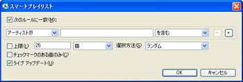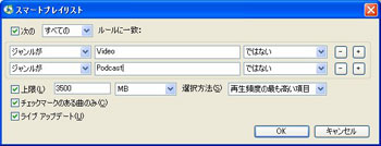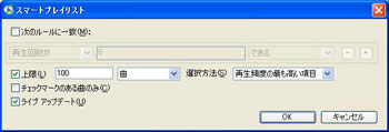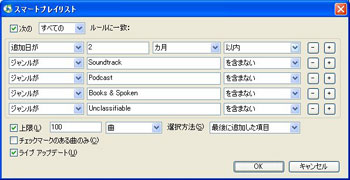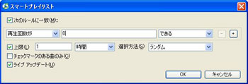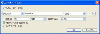 まずおさらいですが、iTunesのプレイリストと スマートプレイリストの違いをご説明しますね。 どちらもiTunesのライブラリにある曲の中から、 曲を選んでひとまとめにしたリストのことです。 ここでいうリストとは、 コース料理やおすすめ料理を並べた 「メニュー」のようなもので、 実際にiTunes中で曲の場所が 移動するわけではありません。 ※iTunesに最初から用意されている 「トップ25」(再生頻度が高い順に25曲選ばれます)や 「トップレート」(再生回数が10回より多い曲が ランダムで25曲選ばれています)も スマートプレイリストのひとつです。 ![]() ▲iTunesの左ナビにある、 「♪(音符)」のついたアイコンがプレイリストで、 歯車のついたアイコンがスマートプレイリストです。 iPod上では、どちらも「プレイリスト」の カテゴリーに入ります。 この2つの違いは‥‥ ☆プレイリスト ・自分でライブラリの中から1曲1曲選んで、 タイトルを右クリックしたり、 ドラッグ&ドロップして作る。 ・自在に曲を集めることができ、 プレイリスト内の曲順も自分で決められる。 朗読や落語、語学レッスンなど 順番がかんじんなものをまとめるときに便利。 たとえば「元気がでる曲集」など 気分に合わせた編集をしたいときにオススメです。 ☆スマートプレイリスト ・条件を設定すると、 自動的に曲をリストアップする。 ・よく聴く曲や新しく追加した曲などを反映して、 リストを自動更新する。 例えば、あるジャンルの音楽を 一気に聴いてみたい! とか、 最近、iTunesに追加した曲だけ知りたい、 音楽とそれ以外を分けたい‥‥ そんなときには、ライブラリの大量の曲の中から、 条件に合うものを瞬時に選び出してくれる スマートプレイリストがオススメです。 しかも、再生回数や曲の追加に合わせて リストアップされた曲を 自動的に更新(ライブアップデート)してくれるところが ナイスなんです! ※更新のタイミングは、曲が終わったときなどです。 再生回数を設定していると、曲が終わったとたんに リストが変わることもあります。 では、実際にスマートプレイリストを作ってみましょう。 スマートプレイリストを作るときの条件は、 曲の「情報」にある曲名、アーティスト、アルバム、 グループ、作者名、コメント、ジャンルなどに加えて、 再生回数、最後に再生した日、iTunesに追加した日、 演奏時間、マイレート(★の数)などの項目で設定します。 スマートプレイリストを新規作成するときは、 iTunesのメニューの 「ファイル」<「新規スマートプレイリスト」を選びます。 ![]() スマートプレイリストの条件設定をする画面が出ます。 ![]() ![]() ▲条件を追加するときは、右端の「+」をクリック。 削除したいときは、右端の「−」をクリックします。 すべてのスマートプレイリストに共通していることですが、 ライブアップデートにチェックマークをつけて 選んでおくと、 条件に応じてリストがどんどん更新されていきます。 今回は私がよく使っているスマートプレイリストの 条件をご紹介します。 ■よく聴く曲だけ100曲選ぶ。 ![]() 自分のよく聴くベスト100を選ぶときには、 「上限100曲」として、 選択方法を「再生頻度の高い項目」にします。 さらに条件を加えて、ジャンルやアーティストを 細かく設定していくと、 お好みの曲だけリストアップすることができます。 ■クラシック音楽だけ選ぶ。 ![]() ジャンルやアーティスト別にスマートプレイリストを 作ることもかんたんにできます。 たとえばクラシックだけ集めたいときは、 ルールを「ジャンルがClassicalである」にすると、 ジャンルがClassicalの曲だけを自動的に選んでくれます。 ジャンルをBooks & Spokenにして、 朗読ものだけをリストアップするとか、 アーティストをBeatlesにして、 ビートルズだけリストアップするとか、 そういった設定もできます。 ■iPod nano用によく聴く曲だけ選ぶ。 ![]() iPod nanoやiPod shuffleなどの容量に合わせて、 上限をMBやGBに設定します。 このときのポイントは、 iPodの中にはプログラムなどがはいっているため、 4GBのiPod nanoでも、4GBまるごとは 入らないということです。 3.5GBにするなど、少なめに設定するとよいようです。 また、iPod nanoやiPod shuffleでは ビデオは視聴できないので、はぶきましょう。 私の場合、音楽だけにしたい場合は、 ポッドキャスト番組もはぶいてます。 ■ここ2ヵ月以内に追加した曲だけ選ぶ。 ![]() iTunesに新しい曲を追加したときに、 ライブラリの曲がたくさんあると、 探し出すのも大変になります。 そんなときには、新しく追加した曲だけを スマートプレイリストでリストアップします。 ルールを「追加日が2ヵ月以内」にして (1ヵ月でも1週間でもよいのですが)、 音楽だけにしぼりたいときは、 Books & SpokenやPodcastを"含まない"設定にします。 ■1回も聴いたことのない曲を 通勤時間分だけ選ぶ。 ![]() ルールを「再生回数0回である」にして、 上限を「時間」にして、 通勤時間の1時間に設定し