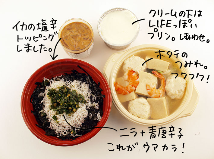うまかった! やわらかい釜揚げしらすがたっぷりで、 そこに乗ってる「青唐」というのが、 青唐辛子のしょうゆ漬けを刻んだものと、 生ニラを細かく刻んで、あえたものだったんです。 この組み合わせがとっても新鮮でした。 (そんなに辛くはないです。) 地のりが、風味を消すということもなかったです。 むしろ引き立て役に徹してる感じ。 これに副菜として買った「塩辛」を乗っけてみたんですけど これは成功! よく合ってました。 反省は、さらに「おしょうゆ」をかけちゃったこと。 ちょっと、しょっぱくなっちゃいました。