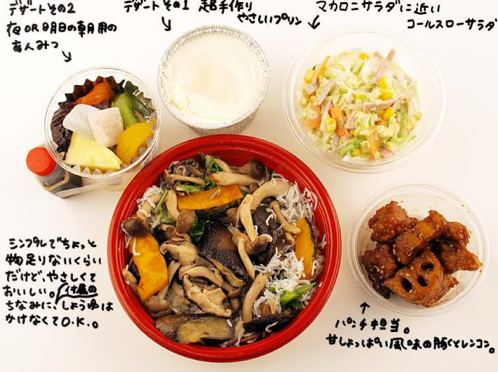 海の幸で全体が覆われた中に、 山の幸がゴロゴロとたくさん入っていて、豪華すぎない、 平凡で幸せな感じが出ていました。 地味なところが、魅力的です。 これを中心に考えて、色々なおかずを選びたかったので、 他をパンチ系にしたりと、バランスをとりました。 デザートは、夜か次の日の朝に食べることを考えて、 おいしそうだったプリンに加えて、 あんみつまで買ってしまいました。 (そしたらとつぜんの予算オーバー!) |
