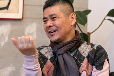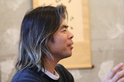 | 日比野 | 展覧会の会場に立ってる自分って なんだかさまにならないなぁ、って しみじみ思ったんです。 いらっしゃいませ、ありがとうございます、 どうですか、また来てね(笑)。 僕は用なしだと思います。 でも、アトリエだと自分が主役です。 |