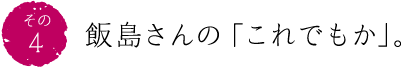 | 糸井 | 飯島さんを、 さっき「男らしい」って言ったけど、 ナンパ師らしいところがあって。 もてる人のやりかたなんだと思うんだけど、 いつも、盛りつけられた分量で、 足りない感じを与えるんですよ。 「次ちょっと食べていい?」って言わせる、 味付けだったり、量だったり。 |