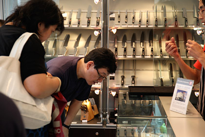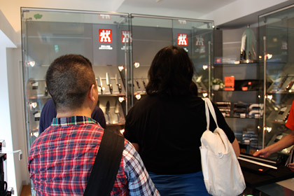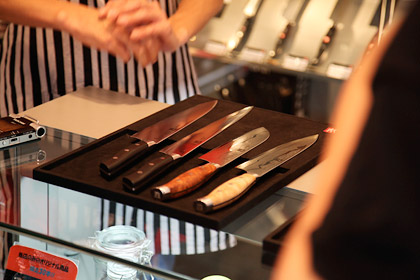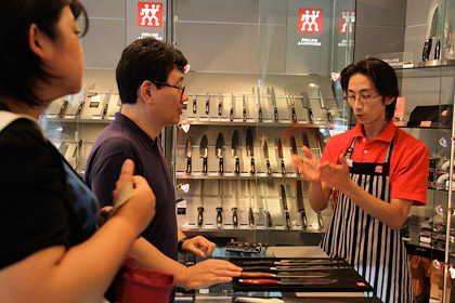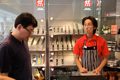 | お店の人 | しかし実際のところは、 両刃のものは利き手がどちらでも 使っていただいて全然問題はありません。はい。 (ヘンケルスで熱心に取材中ですが、 つづきまーす!) |