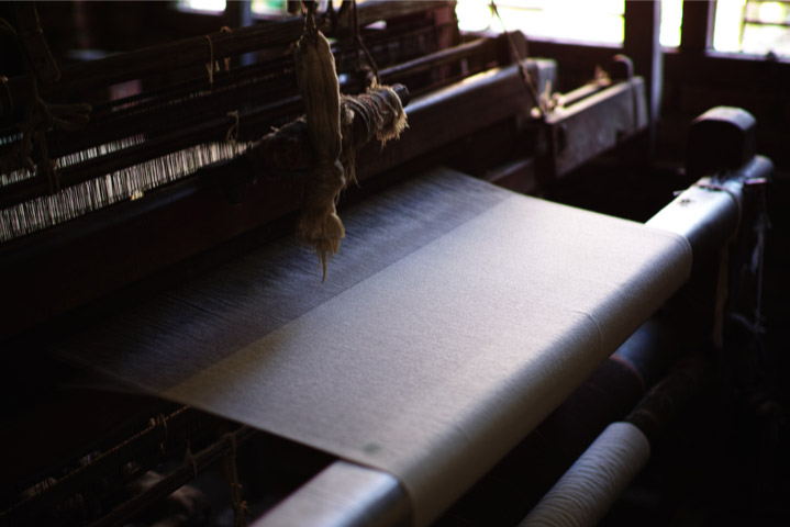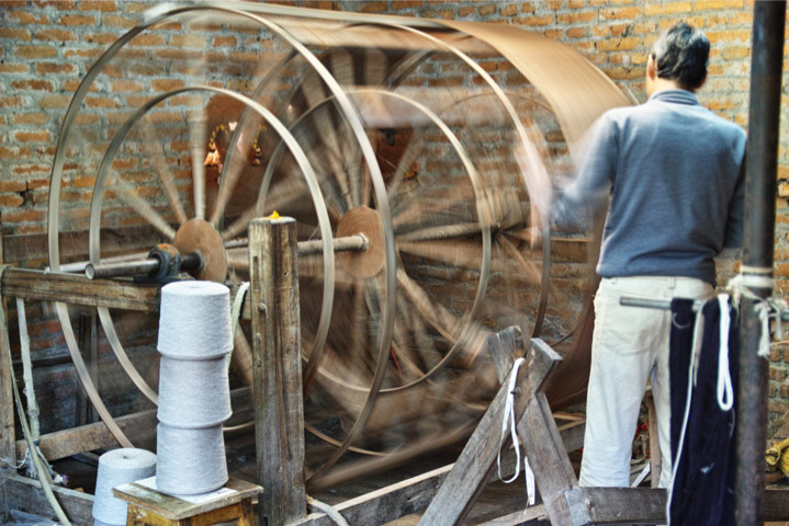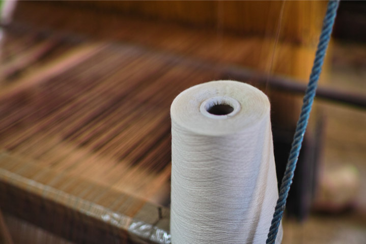 | インドラ | 何度も糸を巻き直し、最後はとても大きな 車輪を使って糸を準備します。 それから糸を織機にセット、 やっと織りはじめるわけですが、 この作業に半日くらい要します。 糸を準備すること(=織ごしらえ)は、 織ることと同じくらいとても重要な作業なんです。 だから、数、そんなにいっぱいは作れないですよね。 |