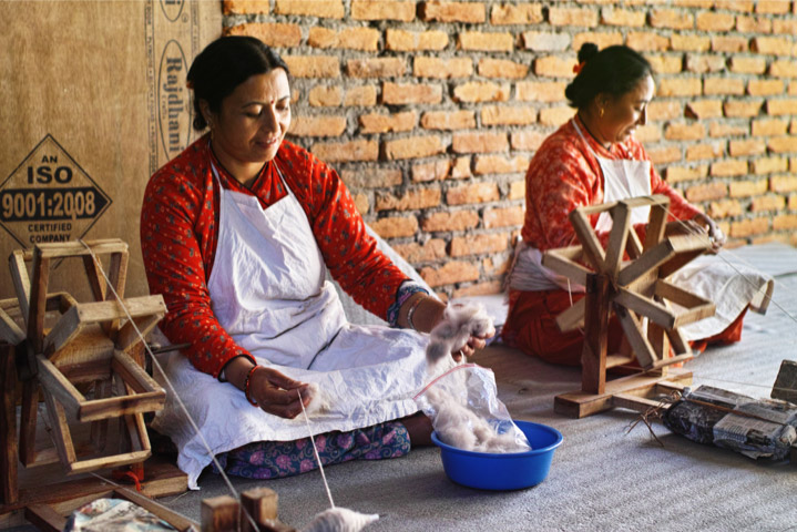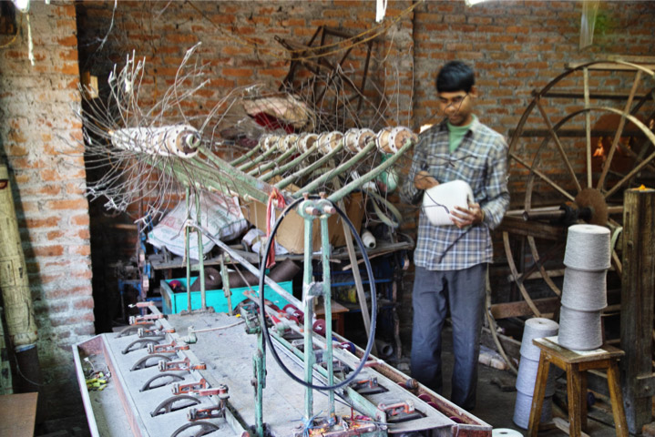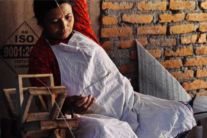 | インドラ | ヒマラヤのカシミアヤギだけでは足りないので、 内モンゴルからも取り寄せているみたいです。 今回のストールは、紡績された一本いっぽんの糸を、 一定の長さや太さに整える作業から。 製品にするまでをラリトプルで行なっています。 |