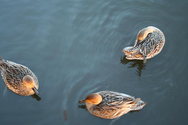 池のカモたちも、朝焼けに染まってオレンジ色。