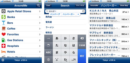 | このアプリは、 iPhoneに内蔵されているGPSの機能を使って、 現在置の周辺にあるガソリンスタンドや コーヒーショップ、病院、銀行などの位置を 教えてくれるんです。 |