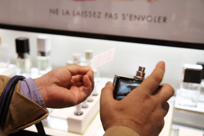 これをね、お試し用の紙、 ムエット(試香紙)って言うんだけれど、 ここにちょこっとつけて、持ち歩きまーす。 どこにいれようかな、 ポケットにいれようかな? かばんに入れてもいいしね。