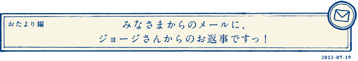 | コンテンツにたくさんの(ほんとうにたくさんの!) メールをいただきありがとうございます。 いただいたメールを ジョージさんに転送しているのですが、 とってもよろこんでくださってます。 いただいたメール、そのごく一部なんですけれど、 抜粋してご紹介させていただきますね。 ジョージさんからのお返事つきで! |