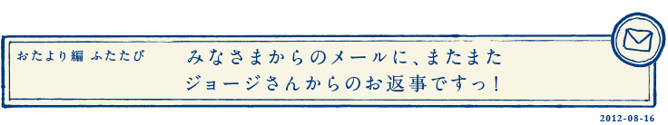 | 「わたしのデパート!」 おかげさまでとてもおおぜいのかたに読んでいただいた コンテンツになりました。 そして、途中でご紹介したメールのあとにも たくさんのおたよりをいただきました。 どうもありがとうございます! ぜんぶ、というわけにはいきませんでしたが、 ジョージさんにいただいたお返事とともに 一気に掲載させていただきますねー! |