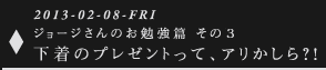 | ジョージ | 逆に、男の人はこういうものを もっと理解しないといけないですね。 あの‥‥ブラジャーのサイズって、 どういう分類になってるんですか? そういうことすら知らずにいて、すみません。 ABCD‥‥? |