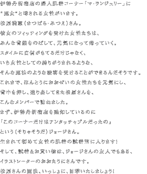 伊勢丹大好き、ほとんどのフロアを知っているわ! というジョージさんですが、 唯一、プライベートで 足を踏み入れたことがなかったのが 婦人肌着の売り場だそうです。 じっさいに取材にうかがう前に、 ボディコンシェルジュの松原さんにお目にかかり、 予習をさせていただくことになりました。 |