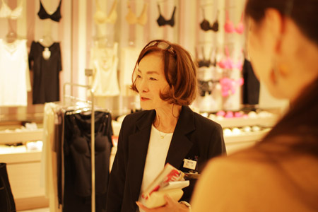 | 松原 | そうなんです。「天使のブラ」で、 これは丸くカップが出るタイプですが、 従来の「天使のブラ」はシャープな印象です。 けれどもつけ心地はこちらのほうが ちょっと楽かなって感じもします。 どちらにしても、日本製のものは、 お肉をきちっとカップに入れるっていうことなんですよ。 |