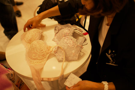 | 松原 | あぁ、それが何より。 今回は、1つのメーカーじゃなくて、 いろいろなところのを着けたほうがいいと思って 揃えております。 まず、日本製の、 ワコールから行きましょう。 |