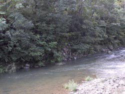| その26 食べてはいけない! 環境庁は絶滅の危機に瀕した生物を、 レッドリストに記載して注意を呼びかけています。 いくつかランクがあるのですが、 そのうち最も絶滅の心配が高い生き物がA類。 北海道のシマフクロウや対馬のツシマヤマネコ、 沖縄のノグチゲラなどが同ランクですが、 奄美地方では3種類のセキツイ動物が指定されています。 鳥類のオオトラツグミと魚類のタイワンキンギョ、 それにリュウキュウアユです。 アユは屋久島以北の日本各地に広く分布していますが、 リュウキュウアユは奄美大島と沖縄本島にしかいません。 しかも沖縄本島では野生下では一度絶滅しており、 現在さかんに放流して呼び戻す努力をしている真っ最中。 つまり琉球鮎なのに、奄美大島でしか会えないわけです。 秋は落ち鮎の季節。 こりゃリュウキュウアユが観られるのではないかと思い、 勇んで川に出かけました。 最初に行ったのは大和村の川内川の上流域。 かごをしかけてモクズガニ漁をしているおじさんがいます。 こちらも渓流足袋を履いて水の中に入り、 水中眼鏡をつけておもむろに淵をのぞきます。 魚影確認! しかしどう見ても流線型ではありません。 川底にしがみついているその姿は…ボウズハゼでしょうか。 向こうの色がついている魚はヨシノボリの仲間のようです。 次に行ったのが宇検村の河内川の中流域。 さっそく川に入ります。 シマアメンボがせわしなく旋回する水面をかきわけ、 水中をのぞいてみると、半透明のエビたちの姿を発見。 地元でタナガと呼ばれるテナガエビや サイと呼ばれるヌマエビの仲間です。 淵の深いところにはガンと呼ばれるモクズガニもいます。 残念ながら優雅なアユは影も形もありません。 三度目の正直で挑んだのは住用村の住用川の中流域。 前日の雨で水量が増して、水も少し濁っています。 期待薄かなと思いながらも川の中をのぞいてみます。 エビ、カニ、ハゼ… 見慣れた面々に再会はするものの肝心のアユの姿はなく、 あきらめかけたそのとき、 ふと瀬のほうを見ると光が走るではありませんか。 15cmくらいの大きさの銀色の影が 悠々と石の間を周回しているのです。 ちゃんと体の側面の黄色のスポットも確認できます。 ようやくリュウキュウアユとご対面です。 とっつかまえて竹串に刺し、粗塩をまぶして炭火で焼く。 焼きたての熱々を皮ごと頬張る…さぞかし美味かろうなあ。 ごっくん、不謹慎な思いがついつい頭をもたげます。 いかんいかん、絶滅危惧種、絶滅危惧種…。 住用川中流域。ここに美味そうなアユが…。 |