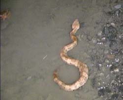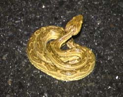 | その34 奄美大島発正月レポート 正月気分も去り、日常のリズムが戻ってきた頃でしょうか。 加速度的にスピードアップしていく毎日の中で、 記念すべき新世紀の幕開けもすでに遠い昔の出来事のよう。 そんなときに何をいまさらといわれそうですが、 あけましておめでとうございます! なにしろ奄美と本土は時の流れ方が多少ずれているので、 時期はずれの年始のごあいさつもご愛嬌とお許しください。 あ、お年賀のプレゼントは干支にちなんだ縁起物で。 見事にとぐろを巻いたハブの幼蛇 奄美で迎えた初めての正月を雑感風にまとめてみます。 生憎の曇で初日の出は雲間からかすかに覗けただけの元日。 この日は各家庭で三献(さんごん)の儀式を行うせいか、 名瀬の街はことのほか静かでした。 翌2日、帰省中の若者で街は一転賑わっていました。 奄美大島の若者のほとんどは高校を卒業した後、 一度は島外に出るようです。特に関西方面が多いようで、 通常1往復だけの伊丹空港との直行便も年末年始は3往復。 普段はお年寄りが目立つ大島も正月は活気を取り戻します。 三ヶ日の間に初詣に行こうかと思ったものの果たせず。 キリスト教がさかんな地なので教会は各地にあるのですが、 神社は平家の落人ゆかりの古びた社などいくつかあるだけ。 そもそも奄美の正月に越天楽の雅びな楽の音は似合わない。 むしろ島唄の哀感あふれるメロディがふさわしいのです。 奄美の島唄は沖縄のそれとは違って、実に切ない調べです。 沖縄の島唄が陽なら、奄美の島唄は陰。 正確には知りませんが、音階が琉球音階とは違うようで、 歌い方も高音の裏声を多用した独特のものです。 三線(サンシン)を弾きながら切々と歌われる唄は、 内容こそ方言(島口)でほとんどわかりませんが、 じんわりじわりと胸に染み込んでくるのです。 4日早朝には名瀬市で大火がありました。 家屋16棟が全焼、身元不明の1名が焼死の惨事は 全国ニュースになったらしく、 見舞いや問合せの電話やメールをいくつもいただきました。 幸い同じ名瀬市といってもわたしの住んでいる宅地からは 遠く離れた中心地での出火でしたので被害はありません。 それにしても正月早々焼け出された家族は気の毒なこと。 6日には消防の出初式が行われていましたが、 寒空の下、なんとも寒々しく空々しい気分になりました。 5日は本土よりひと足早く成人式。 新成人の溌剌とし、どこかぎこちない姿が街に溢れました。 伝統産業保護のため、市では紬の着用を呼びかけており、 女性の約半分が、男性の約4分の1が紬姿でした。 黒を基調にした紬を着た女性は普通の振袖姿と比べると シックで落ち着いているようですが、 よく見るととても艶やかです。 紬の和装できめた男性もなかなかに粋なもの。 高価でなかなか手が出ない大島紬ですが、 こうやって眺めていると、一着は欲しくなってきます。 その若者たちも都会に戻り、島に日常が戻ってきました。 わたしもまた、いつものようにフィールドに戻ると… あ、新年早々縁起がいいかも。 リュウキュウアカガエルを狙うヒメハブ |