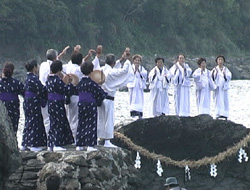 一方手前の岩にはグジ(宮司)役の男性3人と