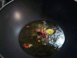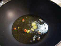 芯をとってつぶしたニンニクと刻んだ鷹の爪を入れ、