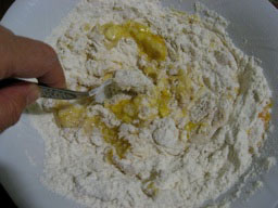 (1)容器に小麦粉を入れ、真ん中をくぼませ、