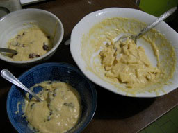 (6)同様にリンゴと粒チョコを入れてかき混ぜる。