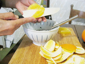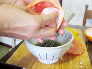 実をとったあとのオレンジをしぼった汁を入れて、