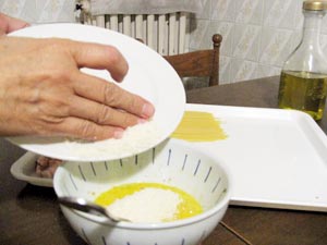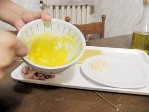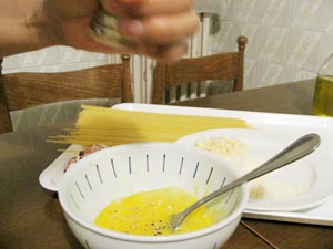 (1)卵に黒コショウをたっぷりと粗めにすって入れる。
