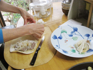 ▲サルシッチャと春玉ねぎのトルティーヤ巻きを