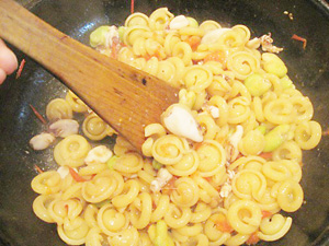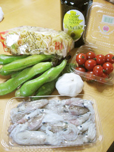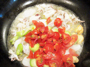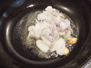 (3)ニンニクの香りが出たら、ヒイカを入れる。