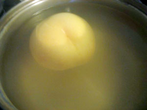 (1)沸騰したお湯の中に洗った桃を入れ、