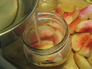 (5)ビンに桃をすきまなく詰めるかんじで入れ、