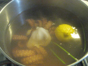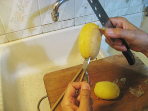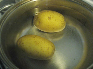 (1)よく洗ったジャガイモを丸ごと水から茹でる。